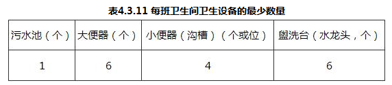 4.3.11 每班卫生间的卫生设备数量不应少于表4.3.11的规定,且女厕大便器不应少于4个,男厕大便器不应少于2个。