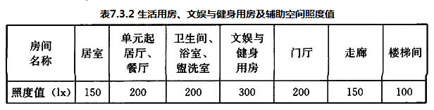 7.3.1 居室、单元起居厅、餐厅、文娱与健身用房宜设置备用照明,照度值不应低于该场所一般照明照度标准值的10%。7.3.2 生活用房、文娱与健身用房及辅助空间照度值应符合表7.3.2的规定。光源宜选用暖色节能光源,相关色温小于3300K,显色指数宜大于80,眩光指数宜小于19。