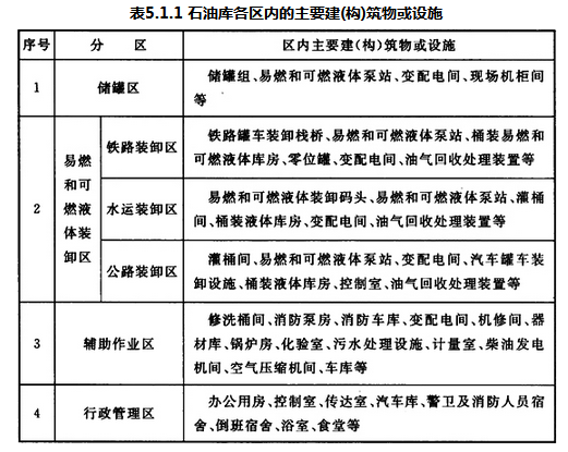 5.1.1 石油库的总平面布置,宜按储罐区、易燃和可燃液体装卸区、辅助作业区和行政管理区分区布置。石油库各区内的主要建(构)筑物或设施,宜按表5.1.1的规定布置。