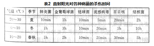 4.3.3 日照是学生健康发育的基本条件,日照时间长短直接关系学生的健康成长。我国卫生部的专题科研成果指出,人体只能通过每天有一定时间的日照才能合成维生素D,日照对抑制癌细胞的侵袭和体格的生长能发挥重要作用。直射阳光并能够抑制和杀灭部分校内易发传染病的病菌,日照时间对病菌的杀伤作用见表2。