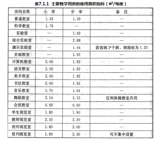 7.1.1 主要教学用房的使用面积指标应符合表7.1.1的规定。