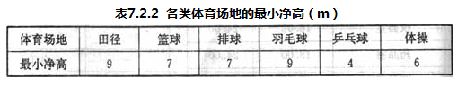 7.2.2 风雨操场的净高应取决于场地的运动内容。各类体育场地最小净高应符合表7.2.2的规定。