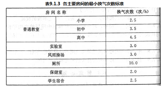 9.1.3 应测算各主要用房的面积与净高,对照本规范表10.1.8中师生对新风量的要求,计算所需的换气次数应符合表9.1.3的规定。