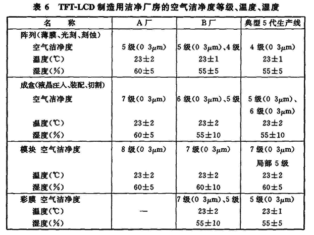 1 表4~表6分别列出8″和4″、5″硅单晶及硅片加工、集成电路的芯片制造、TFT-LCD生产所需的空气洁净度等级、温度、湿度的实例。