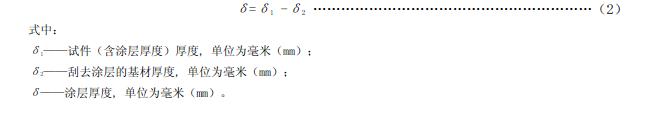 随机抽取已涂刷涂料的试件一块。选3个测点用精度为0.02mm的游标卡尺测量试件涂刷涂料后和涂刷前的厚度,用公式(2)计算单点涂层厚度,涂层厚度为三个测试点涂层厚度的平均值: 6.14.1.2.3 泡层高度