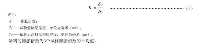 在已施工涂料的构件上,随机选取三个不同的涂层部位,用磁性测厚仪测量其厚度δ1。然后点燃2L汽油喷灯分别对准选定的三个位置,喷灯外焰应充分接触涂层,供火时间不低于5min。停止供火后用游标卡尺测量其发泡层厚度δ2。膨胀倍数按公式(4)求得,结果以三个测试值的平均值表示: 6.14.4.3 检测器具