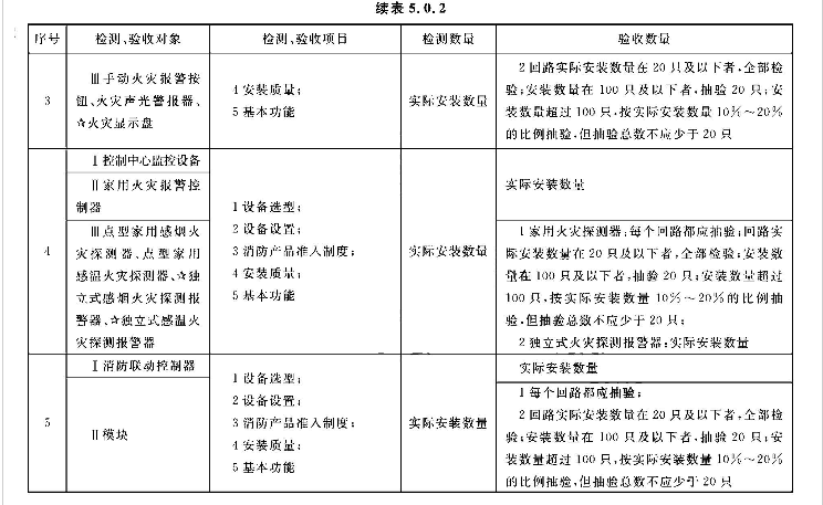 5.0.2 系统的检测、验收应按表5.0.2所列的检测和验收对象、项目及数量,按本标准第3章、第4章的规定和附录E中规定的检查内容和方法进行,按本标准附录E的规定填写记录。