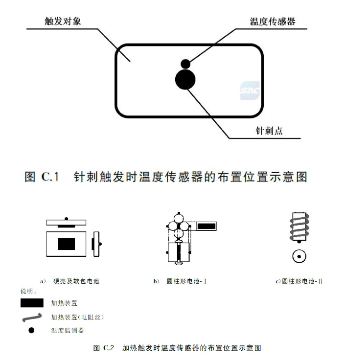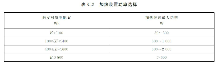 推荐的加热触发热失控方法:使用平面状或者棒状加热装置,并且其表面应覆盖陶瓷、金属或绝缘层。对于尺寸与电池单体相同的块状加热装置,可用该加热装置代替其中一个电池单体,与触发对象的表面直接接触;对于薄膜加热装置,则应将其始终附着在触发对象的表面;加热装置的加热面积都应不大于电池单体的表面积;将加热装置的加热面与电池单体表面直接接触,加热装置的位置应与C.5.3.5中规定的温度传感器的位置相对应;安装完成后,应在24h内启动加热装置,以加热装置的最大功率对触发对象进行加热;加热装置的功率要求见表C.2;当发生热失控或者C.5.3.5定义的监测点温度达到300℃时,停止触发。