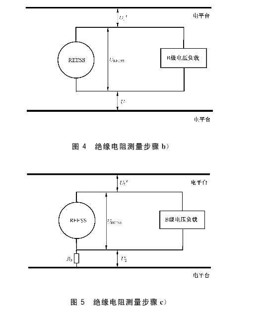 b)用相同的两个电压检测工具同时测量REESS的两个端子和电平台之间的电压,如图4所示。待读数稳定,较高的一个为U1,较低的一个为U1'。