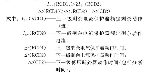多级装设剩余电流保护器时,在动作时限(△t)和额定剩余电流动作值(I△n)应有选择性配合。选择性配合应符合以下两个条件: