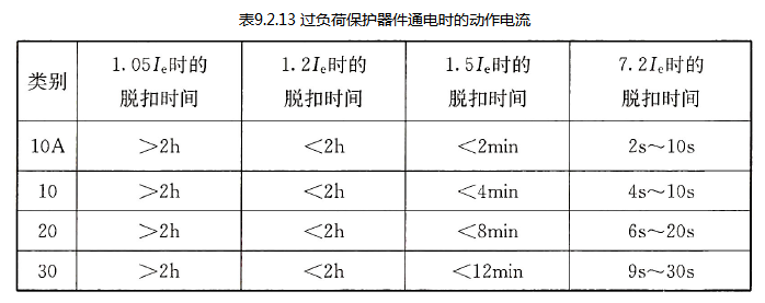 过负荷保护器件应根据设备的特点选择合适的类型,标准的过负荷保护器件通电时的动作电流应符合表9.2.13的规定。