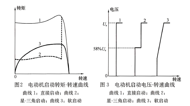 笼型电动机启动方式增加了软启动。图2及图3为笼型电动机软启动、直接启动、星-三角启动的特性曲线。