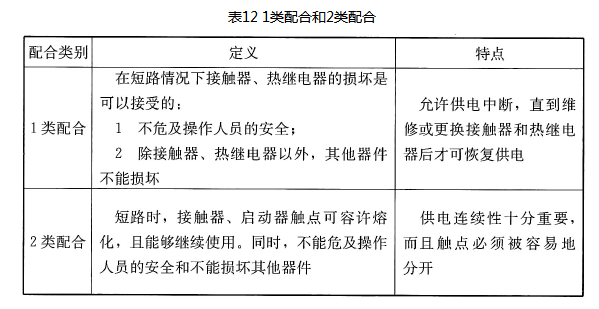 在短路情况下,非重要电动机负荷的接触器、热继电器可损坏,但不应危及操作人员的安全和不应损坏其他器件(1类配合)。重要电动机负荷的接触器、启动器的触点可熔化,且应能继续使用,但不应危及操作人员的安全和不应损坏其他器件(2类配合)。