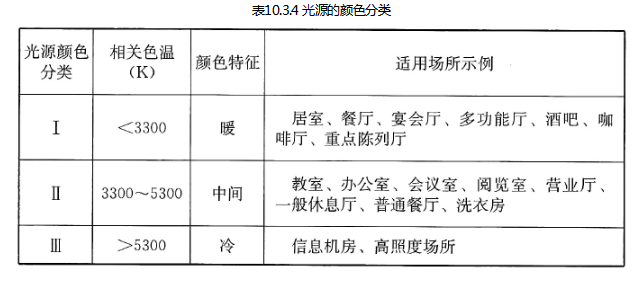 民用建筑室内一般照明光源色表可根据其相关色温分为三类,其适用场所宜按表10.3.4选取。