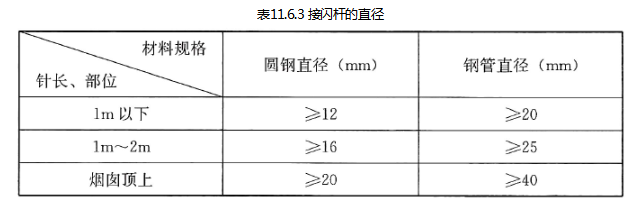 接闪杆宜采用热浸镀锌圆钢或钢管制成,其直径应符合表11.6.3的规定,钢管壁厚不应小于2.5mm。