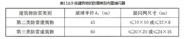 布置接闪器时应优先采用接闪网、接闪带或采用接闪杆,并应按表11.6.9规定的不同建筑防雷类别的滚球半径hr采用滚球法计算接闪器的保护范围。