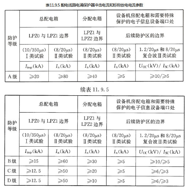11.9.5 配电线路用电涌保护器应根据工程的防护等级和安装位置对电涌保护器的最大持续运行电压、冲击电流、放电电流、电压保护水平等参数进行选择,电涌保护器应能熄灭在雷电流通过后产生的工频续流;用于配电线路电涌保护器的冲击电流和标称放电电流的参数,宜符合表11.9.5