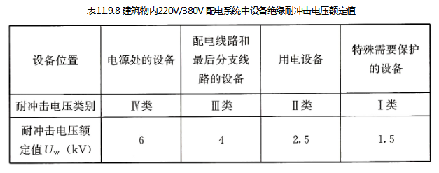 4 需要保护设备的耐冲击电压Uw和220V/ 380V 三相配电线路可按表11.9.8