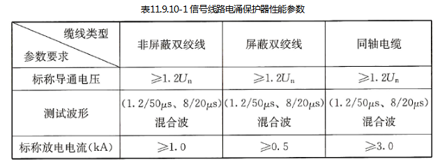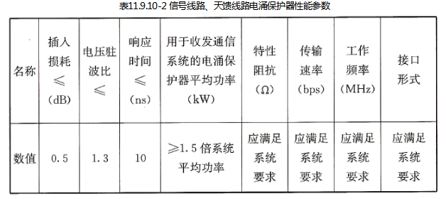11.9.10 电子信息系统信号传输线路电涌保护器,应根据线路工作频率、传输介质、传输速率、工作电压、接口形式、阻抗特性等参数,选用电压驻波比和插入损耗小的适配产品,并应符合表11.9.10-1和表11.9.10-2的规定。