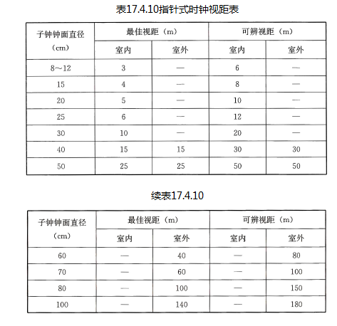 子钟的指针式或数字式显示形式及安装地点,应根据使用需求确定,并应与建筑环境装饰协调。子钟的安装高度,室内不应低于2m,室外不应低于3.5m。指针式时钟视距可参照表17.4.10选定。