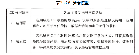 1) OSI参考模型是网络最基本的规范,其描述见表33。