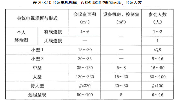 会议电视系统用房宜采用矩形房间,会场面积应按参加会议总人数及设备机房需求确定,具体要求可符合表