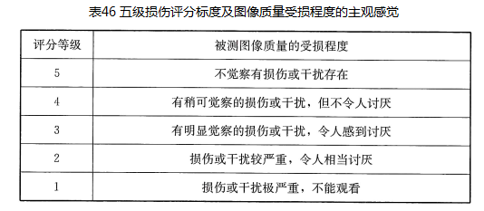 五级损伤制评分等级是根据图像质量受损程度的主观感觉(见表46),对受评图像进行评分。其评分等级与被测图像质量的受损程度的主观感觉应符合本标准第14.3.2条中五级损伤制评定图像等级的要求。