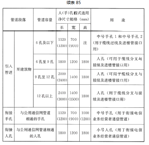 弱电综合管道人(手)孔程式应根据所在管段的用途及容量并按表85选择。