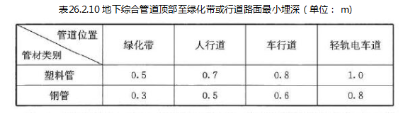 地下综合管道顶部至绿化带地面或人行道路面最小埋深宜符合表26. 2. 10 的规定;