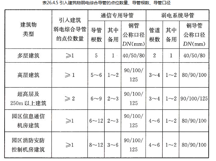 注: 1 本表中引入建筑物弱电综合导管仅表示公称口径为DN40 ~ DN150
