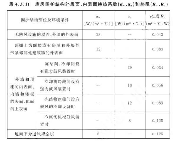 4.3.11 库房围护结构外表面、内表面换热系数(aw、an)和热阻(Rw、Rn)应按表4.3.11的规定选用。