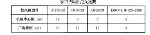 2 鼓风机机组之间和鼓风机与墙之间的距离,应根据操作和检查的需要确定,一般设计尺寸见表13。