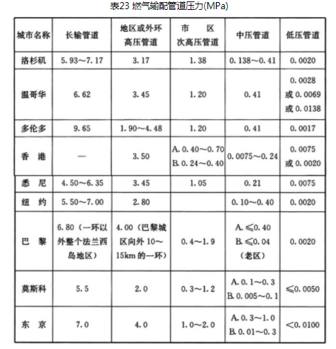 据西气东输长输管道压力工况,压缩机出口压力为10.0MPa,压缩机进口压力为8.0MPa,这样从输气干线引支线到城市门站,在门站前能达到6.0MPa左右,为城镇提供了压力高的气源。提高输配管道压力,对节约管材,减少能量损失有好处;但从分配和使用的角度看,降低管道压力有利于安全。为了适应天然气用气量显著增长和节约投资、减少能量损失的需要,提高城市输配干管压力是必然趋势;但面对人口密集的城市过多提高压力也不适宜,适当地提高压力以适应输配燃气的要求,又能从安全上得到保障,使二者能很好地结合起来应是要点。参考和借鉴发达国家和地区的经验是一途径。一些发达国家和地区的城市有关长输管道和城市燃气输配管道压力情况如表23。
