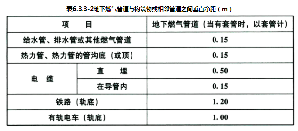 地下燃气管道与建筑物、构筑物或相邻管道之间的水平和垂直净距,不应小于表6.3.3-1 和表6.3.3-2的规定。