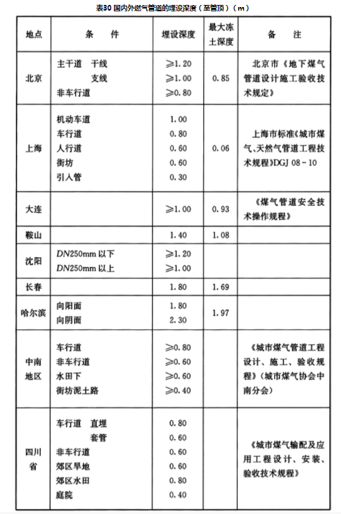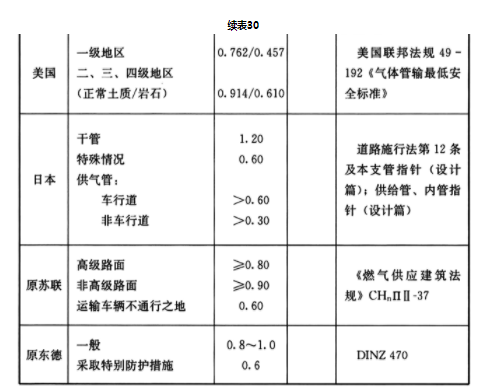 按我国铸铁管的技术标准进行验算,条文中所规定的覆土深度,对于一般管径的铸铁管,其强度都是能适应的。如上海地区在车行道下最小覆土深度为0.8m的铸铁管,经长期的实践运行考验,情况良好。此次修编中将埋在车行道下的最小覆土深度由0.8m改为0.9m,主要是考虑到今后车行道上的荷载将会有所增加。对埋设在庭院内地下燃气管道的深度同埋设在非车行道下的燃气管道深度早先的规定是均不能小于0.6m。但在我国土壤冰冻线较浅的南方地区,埋设在街坊内泥土下的小口径管道(指口径50mm以下的)的覆土厚度一般为0.30m,这个深度同时也满足砌筑排水明沟的要求,参照中南地区、上海市煤气公司与四川省城市煤气设计施工规程,在修订中增加了对埋设在机动车不可能到达地方的地下燃气管道覆土厚度为0.3m的规定,以节约工程投资。“机动车道”或“非机动车道”分别是指机动车能或不能通行的道路,这对于城市道路是容易区分的,对于居民住宅区内道路,按如下区分掌握:如果是机动车以正常行驶速度通行的主要道路则属于机动车道;住宅区内由上述主要道路到住宅楼门之间的次要道路,机动车只是缓行进入或停放的,可视为非机动车道。目前国内外有关燃气管道埋设深度的规定如表30所示。