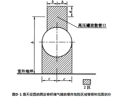 以储罐安全放散阀放散管管口为中心,当管口高度h距地坪大于4.5m时,半径b为3m,顶部距管口a为5m(当管口高度h距地坪小于等于4.5m时,半径b为5m,顶部距管口a为7.5m)以及管口到地坪以上的范围为2区。储罐底部至地坪以上的范围(半径c不小于4.5m)为2区。
