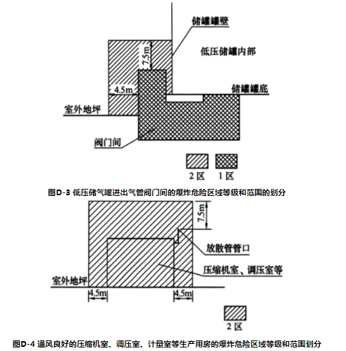 4) 通风良好的压缩机室、调压室、计量室等生产用房的爆炸危险区域等级和范围划分见图D-4。