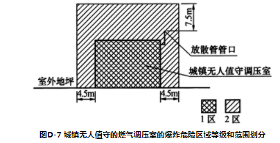 7) 城镇无人值守的燃气调压室的爆炸危险区域等级和范围划分见图D-7。