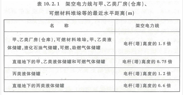 架空电力线与甲、乙类厂房(仓库),可燃材料堆垛,甲、乙、丙类液体储罐,液化石油气储罐,可燃、助燃气体储罐的最近水平距离应符合表10.2.1的规定。