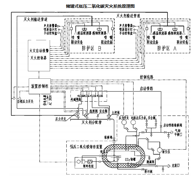 说明:1.本图为典型的两个防护区组合分配系统原理图。对于单元独立系统,除无灭火剂分配管,选择阀以及控制选择阀的电磁阀外,其余组件和部件与组合式分配系统是基本一致的。
