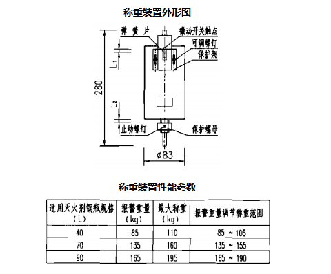 1.本组件用于三氟甲烷、高压二氧化碳灭火剂储瓶的称重。当储瓶内灭火剂重量少于原充装量的95%(CO2为90%)时,微动开关动作,接通报警器发出报警信号。