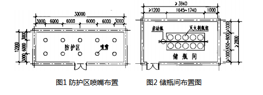 根据本图集喷嘴布置有关参数,喷嘴布置间距采用6m,喷嘴至墙面的距离采用3m,防护区共需布置喷嘴10个。如图1所示。