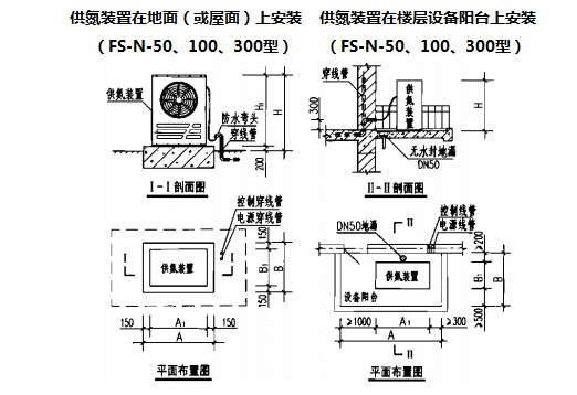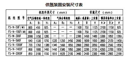 说明:1.供氮装置安装在专用设备间时,设计人员可参照设备阳台安装尺寸进行布置,机组与墙面的距离宜适当放大。