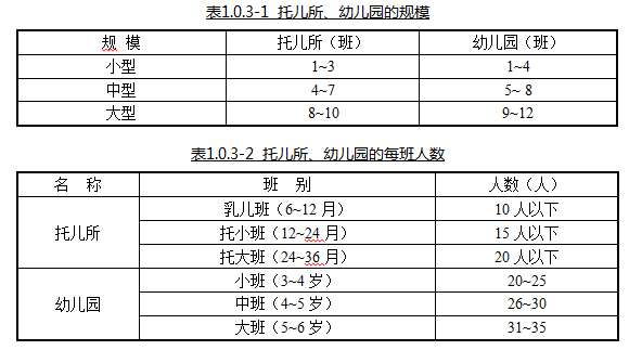 1.0.3 托儿所、幼儿园的规模应符合表1.0.3-1的规定,托儿所、幼儿园的每班人数宜符合表1.0.3-2的规定。