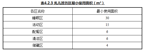 4.2.3 乳儿班应包括睡眠区、活动区、配餐区、清洁区、储藏区等,各区最小使用面积应符合表4.2.3的规定。