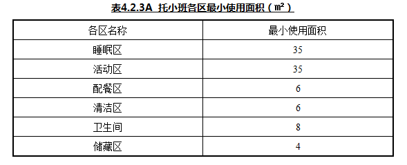 4.2.3A 托小班应包括睡眠区、活动区、配餐区、清洁区、卫生间、储藏区等,各区最小使用面积应符合表4.2.3A的规定。