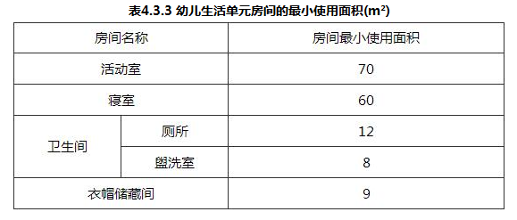 4.3.3 幼儿园生活单元房间的最小使用面积不应小于表4.3.3的规定,当活动室与寝室合用时,其房间最小使用面积不应小于105m²。