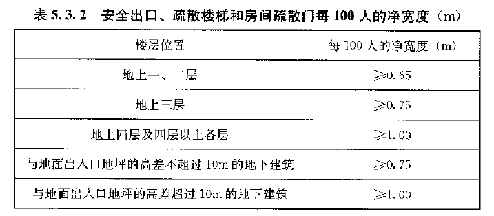 1 每层安全出口、疏散楼梯的净宽应按表5.3.2的规定经计算确定;当每层人数不等时,疏散楼梯的总宽度可分层计算,下层楼梯的总宽度应按其上层人数最多一层的人数计算;