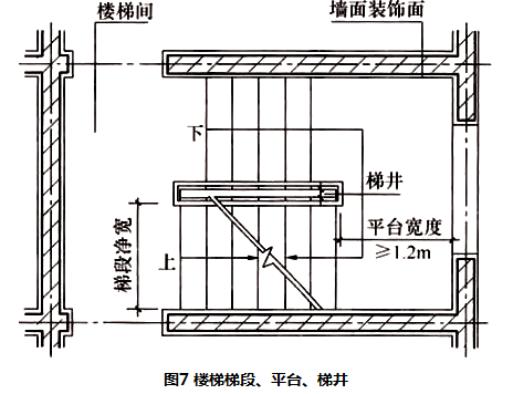 本条规定了当梯段改变方向时,扶手转向端处的平台最小宽度不应小于梯段净宽,并不得小于1.20m,同时应考虑不同类型建筑对楼梯宽度的要求,满足平台最小宽度以保持疏散宽度的一致,当有搬运大型物件需要时应适量加宽,并能使家具等大型物件通过,见图7。