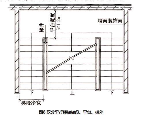 双分平行楼梯扶手转向端处的平台最小宽度也不应小于梯段计算最小净宽,并不得小于1.20m,见图8。